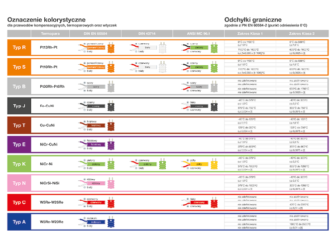 Termoelektryczne (termoparowe) czujniki temperatury powinny być łączone z urządzeniem pomiarowym przewodem właściwym dla typu termopary. Pomocne w tym jest stosowanie oznakowania kolorami, odpowiednio dla ich żył oraz koloru izolacji zewnętrznej przewodu. Takie normy, jak IEC 60584, DIN czy ANSI systematyzują kwestię oznaczania i identyfikacji.