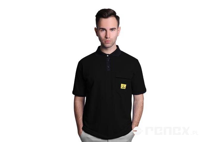 Koszulka ma klasyczny, uniwersalny krój (damski/męski) i zapięcie na trzy guziki. Z przodu, na lewej piersi, znajduje się kieszeń z widocznym oznaczeniem ESD, co ułatwia identyfikację odzieży w środowisku produkcyjnym.