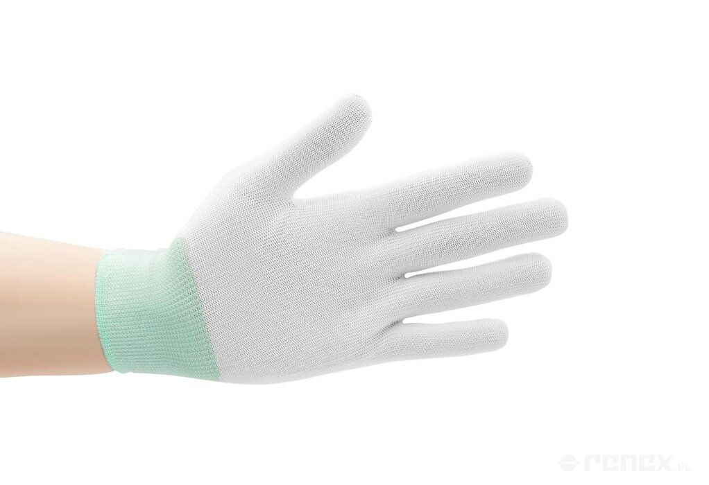 Elastyczna dzianina dobrze dopasowuje się do dłoni, gwarantując swobodę ruchów i komfort podczas długotrwałej pracy. Neutralny, biały kolor ułatwia kontrolę czystości w strefach EPA.