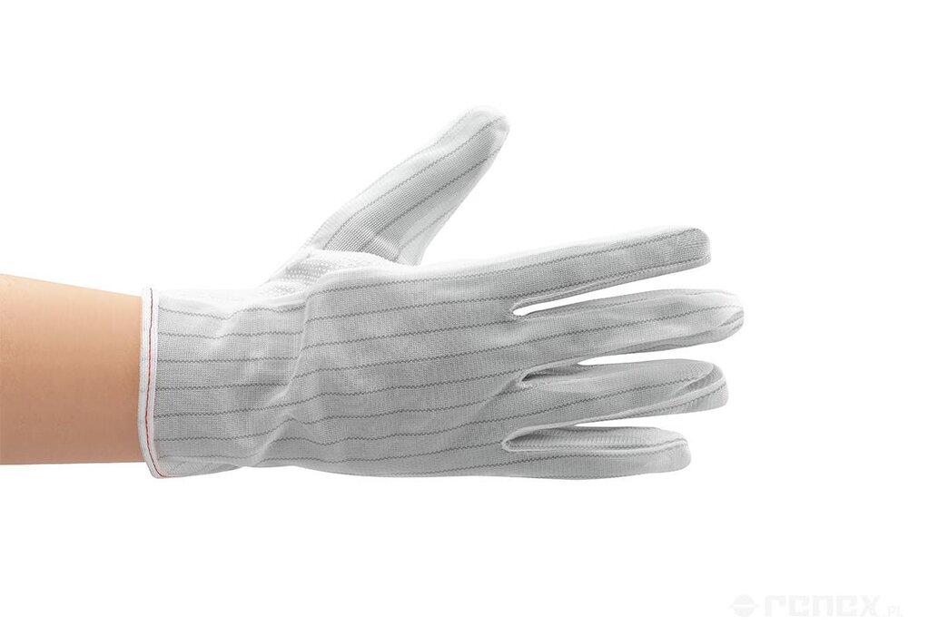 Profesjonalne rękawiczki antystatyczne ESD do pracy w środowiskach wrażliwych na wyładowania elektrostatyczne. Wykonane z poliestru z dodatkiem syntetycznej gumy, zapewniają skuteczne rozpraszanie ładunków i pewny chwyt dzięki kropkowanej warstwie antypoślizgowej na dłoni. Lekkie i elastyczne, sprawdzają się podczas precyzyjnych operacji montażowych i kontrolnych. Można je prać bez utraty właściwości antystatycznych.